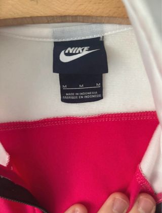 Chaqueta deportiva Nike para mujer, con un diseño moderno y cómodo. - Color principal fucsia. - Paneles laterales y mangas en blanco y negro. - Cuello alto y cierre de cremallera. - Bolsillos laterales con cremallera.