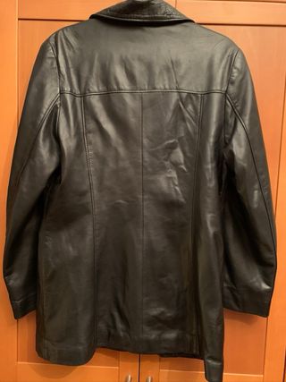 no pone talla pero corresponde a una L. Largo 78 cm Ancho axila 50 cm Es autentico cuero como se ve en las fotos Cuello desmontable.
