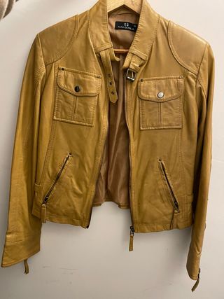Chaqueta de cuero en color mostaza - Cierre de cremallera frontal. - Dos bolsillos con solapa en el pecho. - Dos bolsillos con cremallera en la parte inferior. - Cuello con hebilla ajustable.