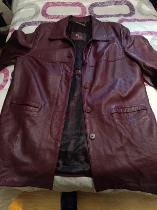 Chaqueta de cuero para mujer, de corte 3/4. - Material: Cuero - Color: Rojo oscuro - Diseño: Chaqueta larga con botones - La talla es XL, pero en realidad es más una M. - Medidas de la prenda: hombro 42cm, pecho 51cm, cintura 44cm, manga 61cm (desde sisa 46cm), largo 90cm)