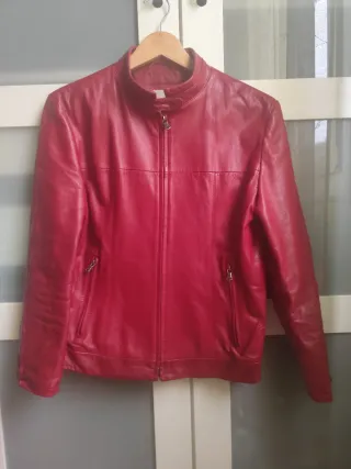 Chaqueta de cuero en un llamativo color granate. 100 % cuero. En perfecto estado. Muy poco uso. - Cuello redondo. - Cierre de cremallera frontal. - Dos bolsillos laterales con cremallera. Pone talla 46 pero corresponde a una talla S/M (38).