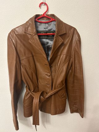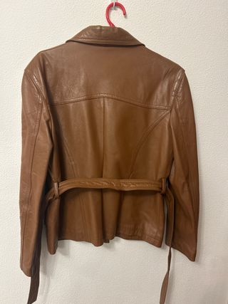 Chaqueta de cuero color marron talla S en muy buen estado - Cierre de cremallera frontal. - Bolsillos con cremallera. - Detalle de cinturón en la cintura.