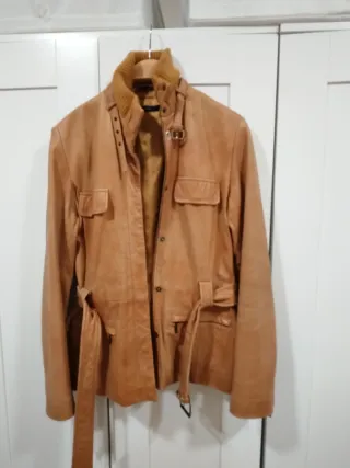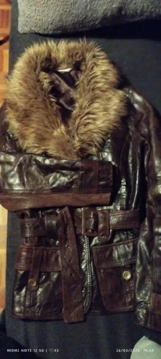 Chaqueta de cuero y pelo en el cuello (el pelo del cuello es sintético y es desmontable). Está usada pero en buen estado. Cintura ajustable con cinturón, exterior, forro y botones en perfecto estado. Ideal para ir casual pero con una chaqueta de cuero divina. - Diseño moderno y sofisticado. - Cinturón ajustable para marcar la cintura. - Bolsillos frontales con solapa.