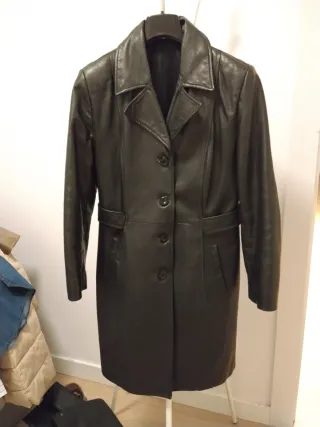 Chaqueta de cuero larga hasta arriba de la rodilla. Un poco entallada en la cintura. Interior forrado, bolsillos laterales. Cierre con botones.