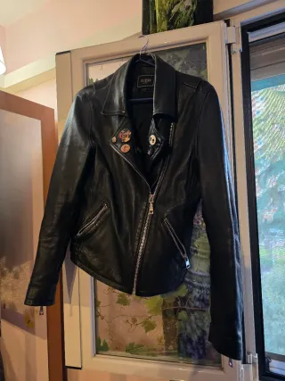 Chaqueta cuero pinchitos/tachuelas, con estampado por detrás. Usada como mucho 4 veces, se ha cuarteado el cuello un poco por el tiempo.