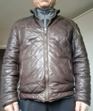 Chaqueta de cuero con cremallera talla 44 pero mas bien es una 42 de sisa a sisa mide unos 50,5 tiene alguna señal de uso hay como un círculo duro no se si le caería algo y está algo cuarteado se muestra en las fotografías de ahí su precio NO ES NEGOCIABLE