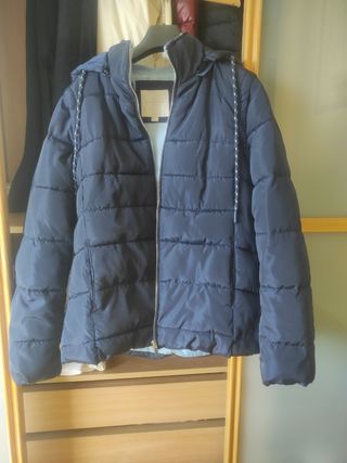 Chaqueta acolchada con capucha y cierre de cremallera. - Diseño acolchado. - Cierre de cremallera frontal. - Cordones decorativos en la capucha. Sin apenas uso, semientallada y bien abrigada. Son dos en uno chaqueta tb chaleco
