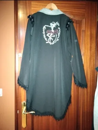 Prenda versátil que puede usarse como chaqueta o vestido. - Diseño en color negro. - Adornos de estrellas y detalles de encaje. - Cuello estampado a cuadros.