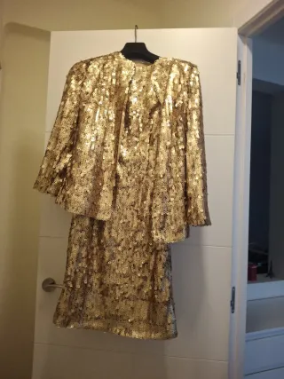 Elegante conjunto de dos piezas compuesto por un vestido y una chaqueta. - Diseño brillante con lentejuelas. - Color dorado llamativo.