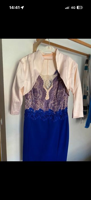 Elegante conjunto de vestido y chaqueta. - Vestido largo. - Chaqueta corta con detalles bordados. - Diseño con escote adornado.