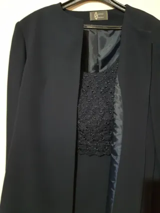 Elegante conjunto de vestido y chaqueta. - Chaqueta de corte moderno. - Vestido con detalle de pedrería y encaje. - Forro interior de satén.