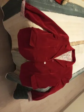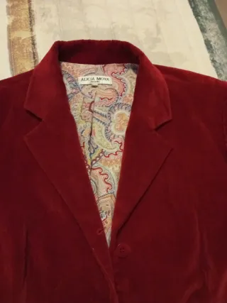 Chaqueta de vestir en antelina de color granate. Presenta un diseño elegante y moderno. Pone 48 pero talla más como 44-46. - Cierre de tres botones. - Bolsillos frontales. - forro estampado Manga con botones