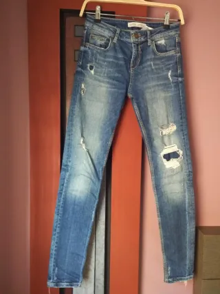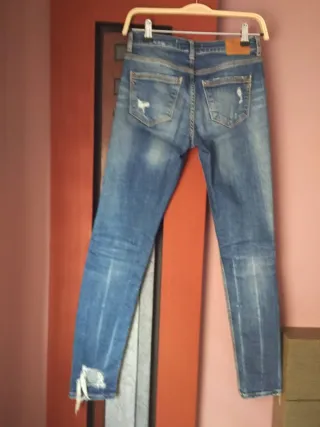 Pantalones vaqueros de mujer de la marca Bershka con un estilo desgastado y moderno.Se ha usado pero esta bien conservado. Talla 34. Se puede ver sin ningún compromiso. Más cosas en mi perfil y más pantalones, Sueters, vestidos, tops, camisetas, chaquetas - Diseño con rotos y detalles desgastados. - Corte recto y favorecedor. - Lavado clásico en tono azul.