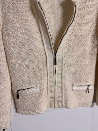 👚 Chaqueta de punto con hilo lurex dorado para mujer de la marca Studio Classics. 📏 Talla 38. Ancho de sisa 39cm. Ancho de hombros 37cm. Largo de mangas 47cm. Largo 50cm. 💫 Cierre con cremallera frontal y bolsillos. Detalle de cremalleras en los puños. ➡️ También disponible vestido color coral de la marca Pedro del Hierro (talla 40). Vendo junto o por separado. ✔️ Todo en perfecto estado. Ningún defecto ni desperfecto.