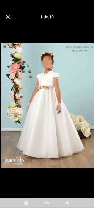 Precioso Vestido de Comunión y arras de niña de la marca Creaciones Marigar modelo 8339 Corte de baile/princesa Falda lisa, voluminosa y vaporosa hasta el suelo con 3 capas, 2 de tul y 1 de raso Elegante cuello chimenea Cuerpo liso con chaqueta bordada integrada Sobrecuerpo a modo de chaqueta de manga corta Chaqueta y vestido todo en uno Fajín decorado con flores Espalda abotonada TALLA 120 Fabricado en España Incluye: ▪️ cancán - enagua con 2 aros. Cintura ajustable con goma ▪️Bolsa de transporte PERFECTO ESTADO Impecable Lavado y planchado Comprado en boutique especializada en trajes de ceremonia PVP es de 495€ Entrego en mano