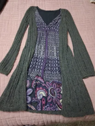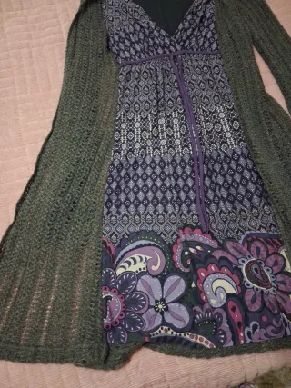 Vestido azul talla S-M. Fino y cómodo. Sin estrenar. Vestido líneas y cuadros.Talla M. Fino y cómodo. Sin estrenar. Chaqueta abierta gris (abriga, ideal para llevar encima de los vestidos y jerseys finos) Talla M Jersey negro largo fino lineas blancas. Chaqueta tejana talla S. Muy usada. Se regala con lo demás. TODO 8€