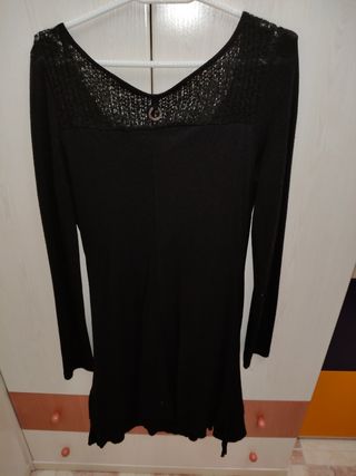 vestido corto estampado de manga por el codo ,con una goma en el puño de la talla 42.. tiene un volante en la parte de abajo. chaqueta de punto de la talla m comprada en Zara en color un rojo oscuro, 2euros. Las dos cosas 6 €