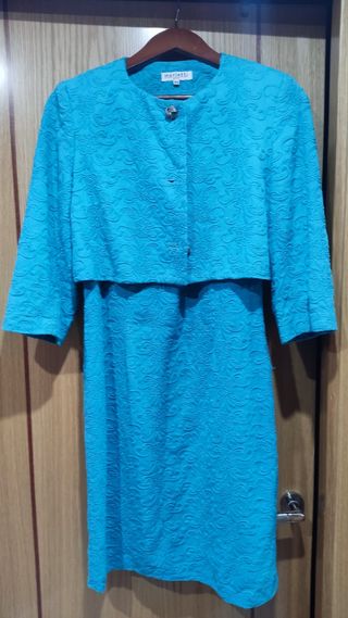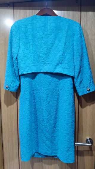 Conjunto vestido tirante ancho y chaqueta corta con manga por debajo del codo en muy buen estado. Tela brocada, puedes ver más ropa en mi perfil 🙂. Mira y perfil te hago precio por lotes. VESTIDO: Hombros 36 cm. Largo 97 cm. contorno pecho 95 cm. CHAQUETA: Hombros 40 cm. Largo 36 cm. Manga 44,5 cm. Más ropa en mi perfil 😊.
