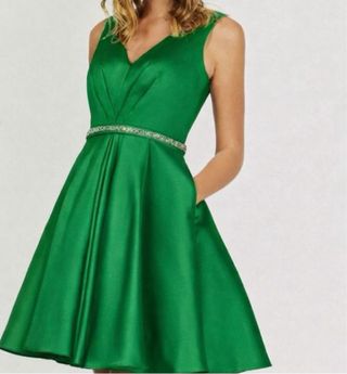 Elegante vestido para fiesta o ceremonia. - La chaqueta encaje verde incluidas - Cinturón a juego con detalle floral y también cinturón de pedreria. - Falda con vuelo y caída. - Escote en V.