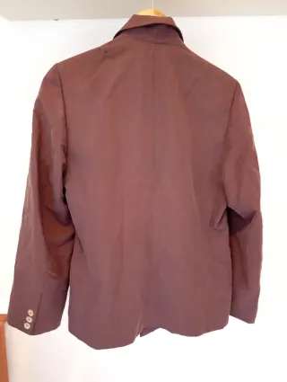 Americana de vestir en color marrón. - Medidas: ancho espalda 43cm, ancho pecho 55cm, manga 62cm y largo 70cm. - Cierre de dos botones. - Bolsillos frontales. - Forro interior.