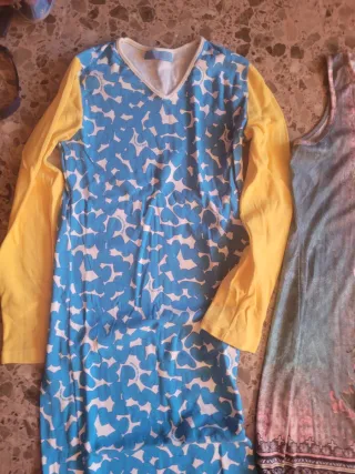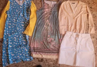 Conjunto de 4 prendas de vestir. Las 4 por 6€ Tallas M y S - Vestido con estampado floral y mangas cortas. Agatha - Camisón de manga larga con estampado de corazones. - Chaqueta de punto fino. Mango - Falda Vaquera de Guess