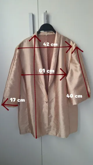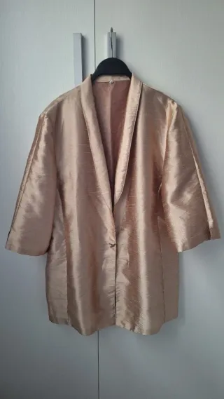 Chaqueta de vestir con un bonito acabado satinado en color oro/ocre. Talla una 42-44 más o menos. Medidas en fotos - Diseño abierto - Manga corta con abertura - Cierre de un botón #chaqueta #chaquetafina #mujer #ocasión #evento #fiesta #Navidad #boda #bautizo #celebracion