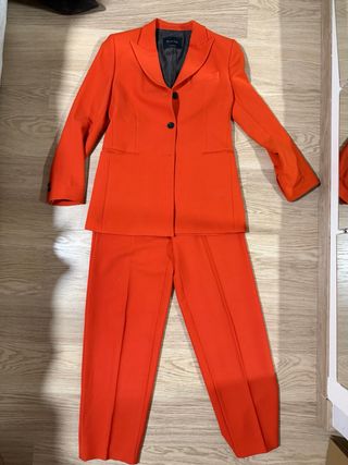 Conjunto de traje de dos piezas en llamativo color naranja butano. - Chaqueta de corte clásico con cierre de botón. - Pantalón de vestir a juego.