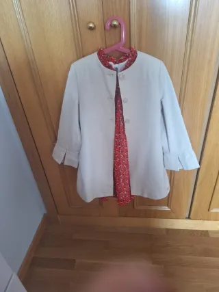 Conjunto chaqueta y vestido color vainilla. Nuevo, puesto solo en una ocasión para una celebración. Comprado en boutique. Su precio fue de 120 € El vestido lleva botones en la parte delantera. Muy práctico y cómodo. No se arruga. Se puede lavar. Talla 46 (46 amplia-48)