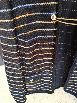 Chaqueta de punto para mujer con un diseño de rayas finas y coloridas sobre fondo negro. Es una prenda elegante y versátil. - Tejido texturizado. - Cierre con broches dorados. - Bolsillos delanteros con botón dorado.