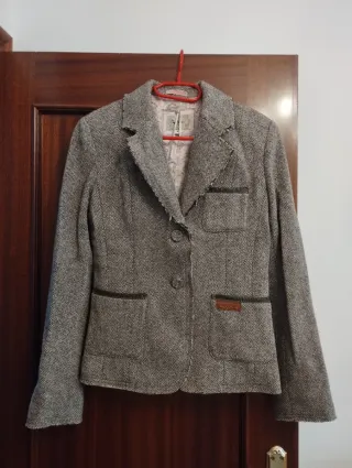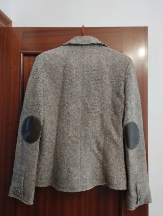 Chaqueta de estilo tweed con un diseño elegante y moderno. - Tejido texturizado en tonos marrones y beiges. - Cierre de dos botones. - Bolsillos frontales con detalle. - Cuello solapa. - Forro interior. - Coderas en la parte trasera de las mangas. - Usada en 2 ocasiones. Está como nueva.