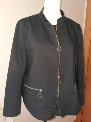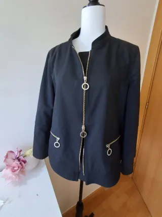 Chaqueta elegante de Purificación García, tipo Gabardina, como nuevo. Color negra, cremalleradoeada y logi, bolsillos, talla 44, medidaslargo61cn y 55cm de sisaasisa, oportunidad. (19). - Diseño con cremallera frontal dorada. - Bolsillos laterales con cremallera y detalle de aro. - Cuello mao. - Corte moderno.