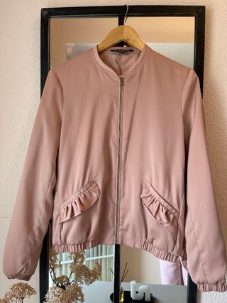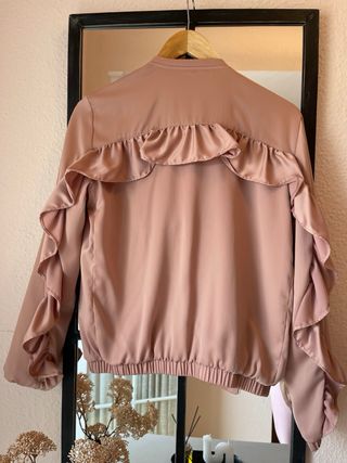 Chaqueta con un diseño elegante y detalles de volantes. - Tejido satinado. - Cierre de cremallera. - Bolsillos con volantes. - Puños y bajo elásticos con volantes.