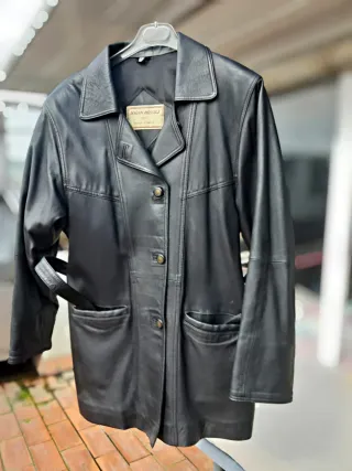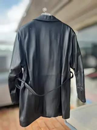 Elegante chaqueta o americana de cuero negro. - Diseño clásico con solapas. - Cierre de un botón. - Bolsillos frontales. - Forro interior.