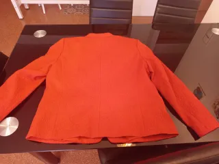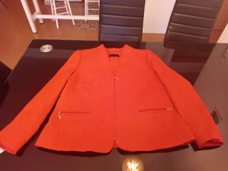 Chaqueta de mujer con un diseño de rayas en tonos rojos y blancos. Presenta un corte clásico y elegante. Talla 40 pequeña Manga francesa Medidas de axila a axila 48 cms y de largo 56 cms - Diseño a rayas. - Cuello solapa. - Cierre de botones. - Bolsillos frontales.