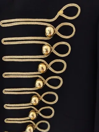 Elegante chaqueta torera con detalles decorativos. - Diseño corto y entallado. - Cierre con botones. - Adornos florales y borlas. - Cuello mao.