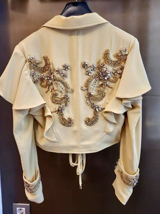 Chaqueta elegante con detalles de pedrería. - Pedrería en la espalda. - Pedrería en los puños. - Cierre con cordones en la parte delantera ( o cruzando en la espalda) - Diseño con volantes en las mangas.