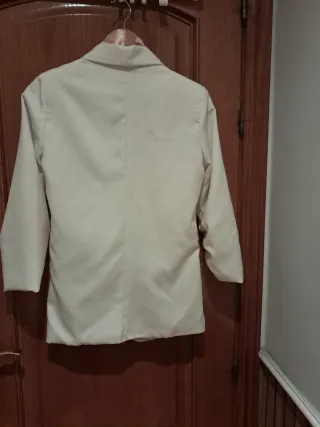 Chaqueta-camisa blanca de diseño original y elegante, con un corte entallado que estiliza la figura. Destaca por su cierre frontal asimétrico. - No pone talla pero será una M. - Marca: Wendy trendy. - Corte: entallado y femenino. - Cuello: amplio tipo cuello vuelto. - Cierre: botones frontales decorativos en diagonal. - Mangas: largas. - Diseño: bajo con forma asimétrica y detalles de costura visibles. - Tejido: cómodo y ligeramente elástico. - Color: blanco. - Estilo: elegante y original, ideal para looks casual chic o de entretiempo. - Estado: usado, en buen estado, sin rotos ni manchas visibles.