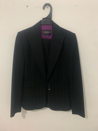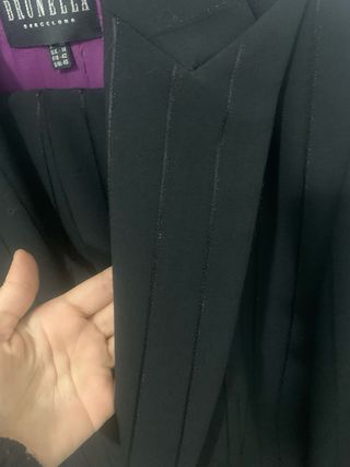 Elegante traje de chaqueta de la marca BRUNELLA. - Color negro con finas rayas verticales brillantes. - Forro interior de color morado. - Cierre de un botón. - Detalle metálico en el cierre.