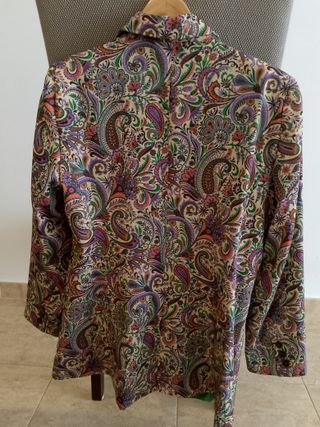 Preciosa chaqueta de la marca LINU, talla S. Es una prenda elegante y vistosa. - Diseño estampado con motivos florales y paisley. - Corte clásico de chaqueta blazer. - Forro interior verde. Estado: Sin usar. Talla S / 36 / 8 Marca LINU Color Multicolor