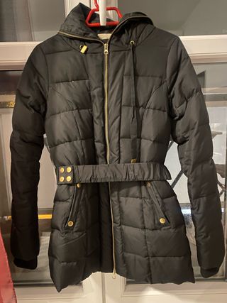 Chaqueta acolchada de color negro, con un diseño elegante y moderno. Se ajusta a la cintura con un cinturón. - Cierre de cremallera. - Bolsillos laterales con botones dorados. - Capucha integrada. - Detalle de botones dorados en el cinturón.