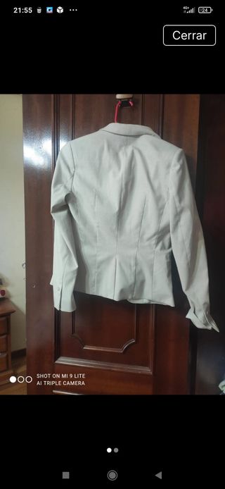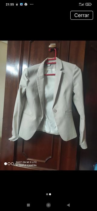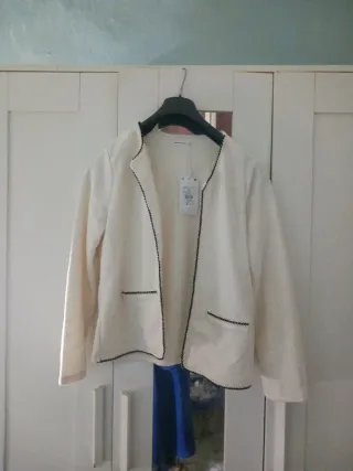 Chaqueta de vestir de Zara, ideal para un look elegante. - Color beige con detalles grises. - Diseño clásico con solapa. - Cierre de un botón. - Bolsillo de ojal en el pecho. - Puños con botones.
