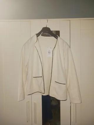 Elegante chaqueta de la marca Encuentro en color marfil. Un básico versátil para cualquier ocasión. - Diseño con ribete negro. - Bolsillos frontales. - Corte abierto.