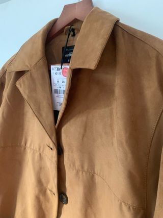 Elegante chaqueta con un diseño moderno y detalles que marcan la diferencia. Está en perfectas condiciones, como nueva. Puesta sólo un par de veces. - Solapa con acabado en efecto piel. - Cinturón para ajustar a la cintura. - Cierre frontal de cremallera. - Botones metálicos dorados.