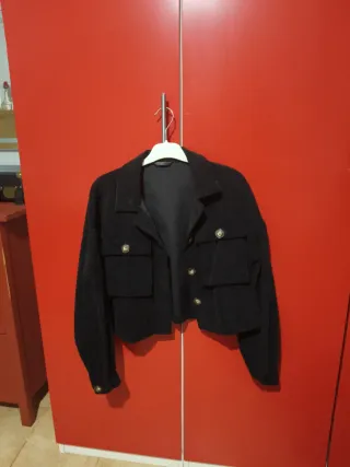 Chaqueta corta de Zara con un diseño elegante y detalles dorados. - Cuello redondo. - Cierre de botones. - Bolsillos delanteros con solapa y botón. - Puños con botón.