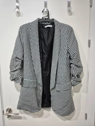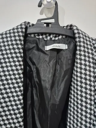 Chaqueta de mujer con un diseño de cuadros clásico y elegante. Perfecta para añadir un toque de estilo a tu vestuario. - Diseño de cuadros en tonos grises y beige. - Costuras blancas visibles que realzan el patrón. -Practicamente nuevo