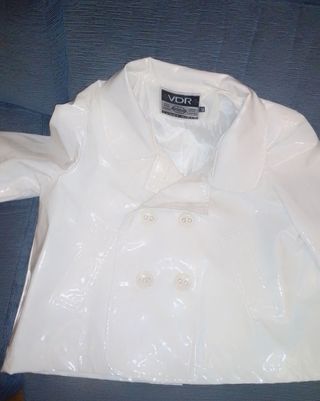 Elegante chaqueta corta impermeable blanca de mujer. - Talla 40. - Marca Vidrio. - Doble botonadura. - Sin estrenar. - Con bolsillos oblicuos laterales. - Poliuretano exterior y forro interior de tela, todo color blanco. - Longitud como una cazadora, 51 cm aprox. - Longitud de manga unos 46 cm. - Corte evasé.