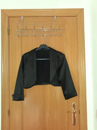 Chaqueta bolero en color negro, para ocasiones elegantes / estilo formal.Estilo/corte: Bolero cropped, mangas largas.Detalles: Sin cierres, satinado brillante.Material: Satén sintético. Talla: 44 (XL, pecho ~104 cm).Medidas aprox.: Ancho pecho 52 cm (plano), largo 35 cm. Estado: Muy buen estado, usado unaxsola vez en una comunion sin manchas ni rotos #bolero #chaquetabolero #boleronegro #talla44 #chaquetaelegante #bolero #bolerojacket #blackbolero #size44 #shrug #boléro #boléronoire #bolerotaille44 #manteau #élégant