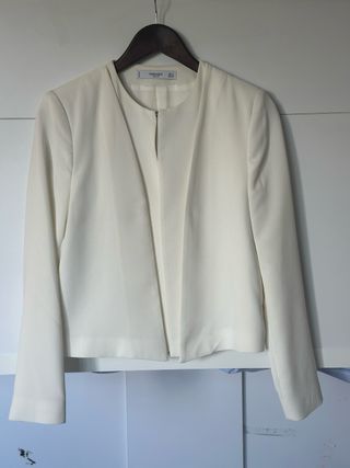 Elegante blazer de Mango, perfecto para eventos especiales. - Diseño de cuello redondo. - Manga larga. - Cierre frontal abierto. - doble solapa - color crema
