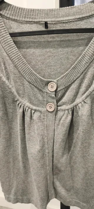Chaqueta de punto en tono gris, con un diseño elegante y cómodo. - Cierre frontal con dos botones. - Cuello redondo. - Mangas largas.