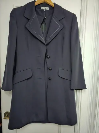 Elegante vestido tipo chaqueta de la marca Carli en color gris. Presenta un diseño sofisticado y moderno. - Cuello solapa con pespuntes decorativos. - Cierre frontal con botones. - Bolsillos de solapa. - Incluye un vestido interior a juego.